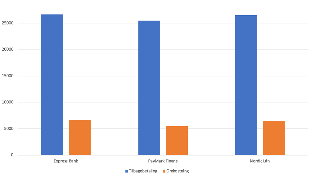 Som du kan se, er der en større omkostning forbundet ved at optage lånet fra Express Bank. Forskellen på omkostningen er 1.140 kroner, hvilket betyder at det er 5,7 procent dyrere at optage lånet hos Express Bank frem for hos PayMark Finans.