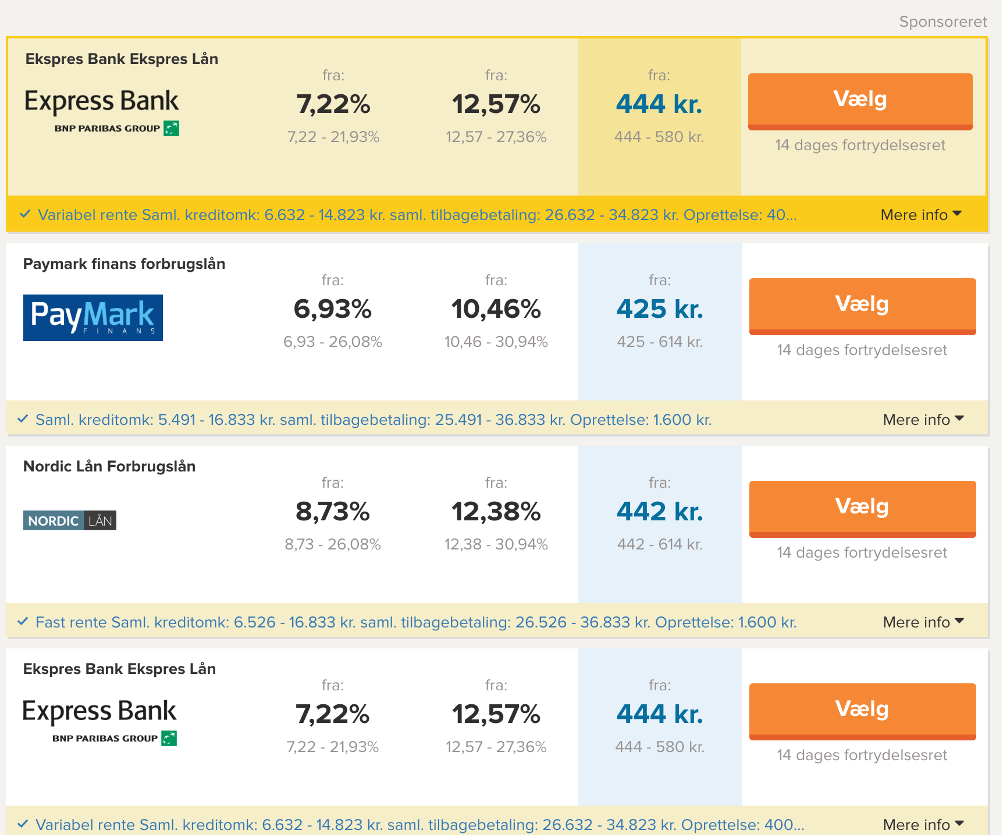Som det ses, bliver Express Bank i dette tilfælde fremhævet som den øverste på siden, og med en iøjnefaldende gul farve. Men ser man nærmere efter på listen, er der faktisk to andre udbydere der er billigere.